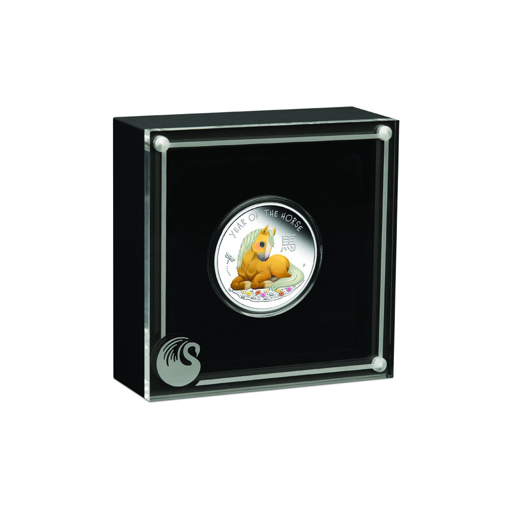 Die Rückseite der Münze zeigt ein farbenfrohes Motiv eines glücklichen Fohlens, das auf einem mit zarten Blumen geschmückten Rasen ruht, über dem eine Libelle fliegt. Das Motiv enthält außerdem das chinesische Schriftzeichen für "Pferd", die Aufschrift "YEAR OF THE HORSE" und das Prägezeichen "P" der Perth Mint.