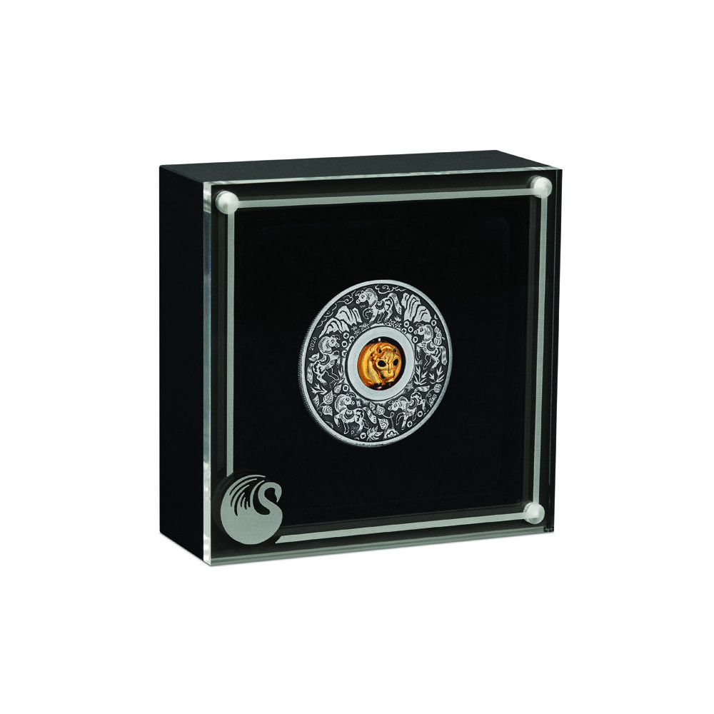 La moneda se entrega con un certificado de autenticidad numerado en un estuche clásico negro con tapa transparente y un elegante embalaje.
