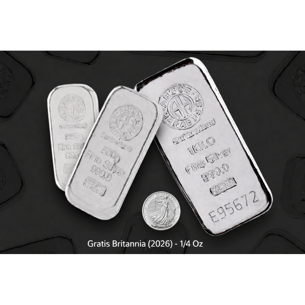 Acquistando 1,75 kg di argento, riceverete una moneta Britannia da 1/4 di oncia completamente gratuita.