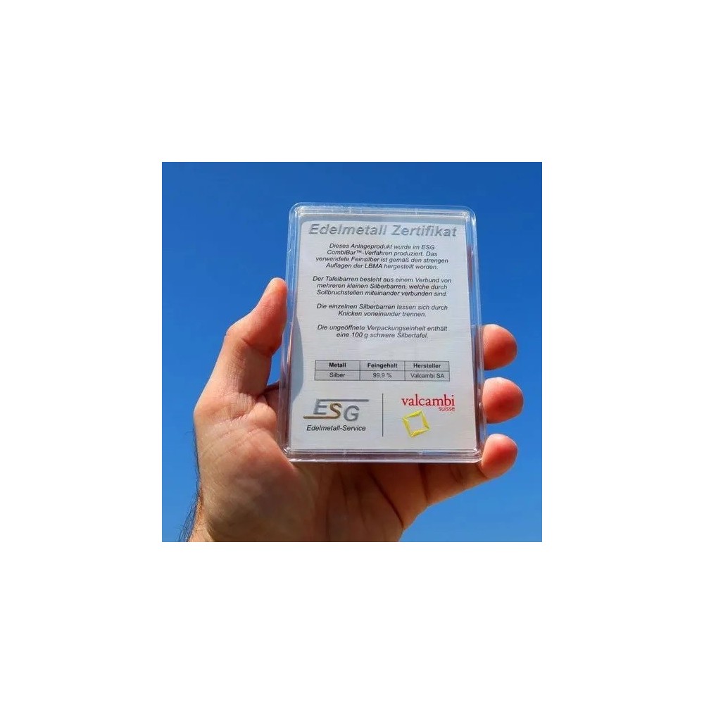 Ogni lingotto è certificato da Valcambi e sarà accettato sempre e ovunque per il suo valore d'argento. Ogni CombiBar™ d'argento Valcambi da 100 g è sigillato in una confezione in PETG che contiene un certificato di saggio numerato in serie.